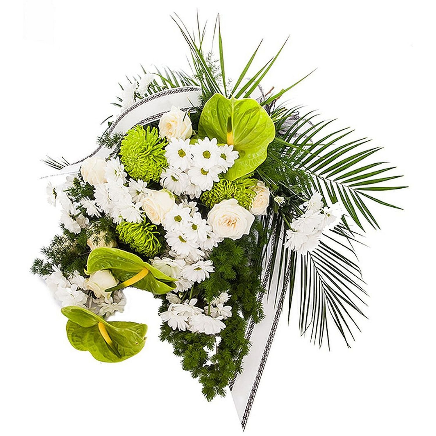 Kompozycja z naszej pracowni łączy starannie wyselekcjonowane białe i zielone kwiaty, tworząc elegancką całość, okraszoną delikatną zielenią liści i klasyczną wstążką. Całość związujemy z dbałością o każdy detal w naszym kwiaciarni. Zapewniamy doręczenie w dniu zamówienia w dni robocze, a także możliwość ustalenia dokładnej godziny dostawy. Gwarantujemy pewność doręczenia oraz potwierdzenie wysyłane na e-mail. Zajmujemy się również dostawą do kaplicy, kościoła lub na wybrane miejsce pożegnania. Wszystko przebiega z należytą troską i dyskrecją.