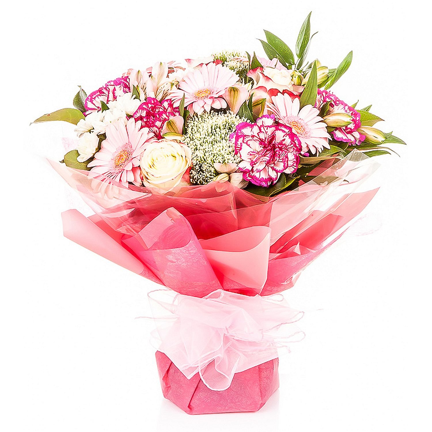 | Standardní | 3 ks karafiát, 3 ks růže, 3 ks gerbera mini, 2 ks santini, 1 ks gypsophila, 2 ks alstromeria, manžeta, mašle a dekorativní zeleň (italský ruscus, salal) |